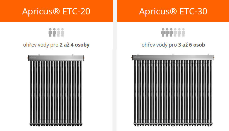 Optimální je použít jeden solární kolektor Apricus® ETC-20 pro ohřev 200litrového zásobníku vody, resp. 1 kolektor Apricus® ETC-30 pro ohřev 300litrového zásobníku apod.. Provoz systému je pak vyvážený a má největší návratnost.